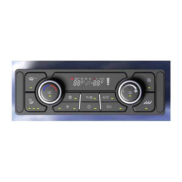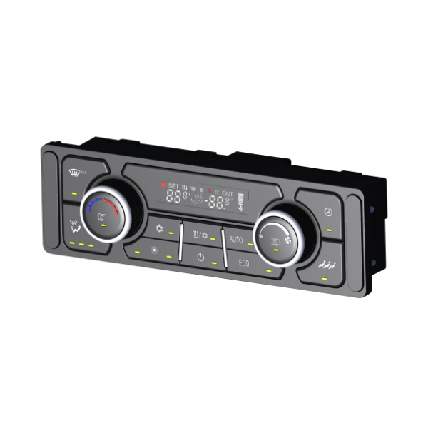 PCM211空调面板,采用双区温控设计,满足高端旅游车对驾驶区和乘客区独立控制的需求,满足客旅团等对空调操作方便性需求较高,配备CAN电控系统空调的中高端车型。